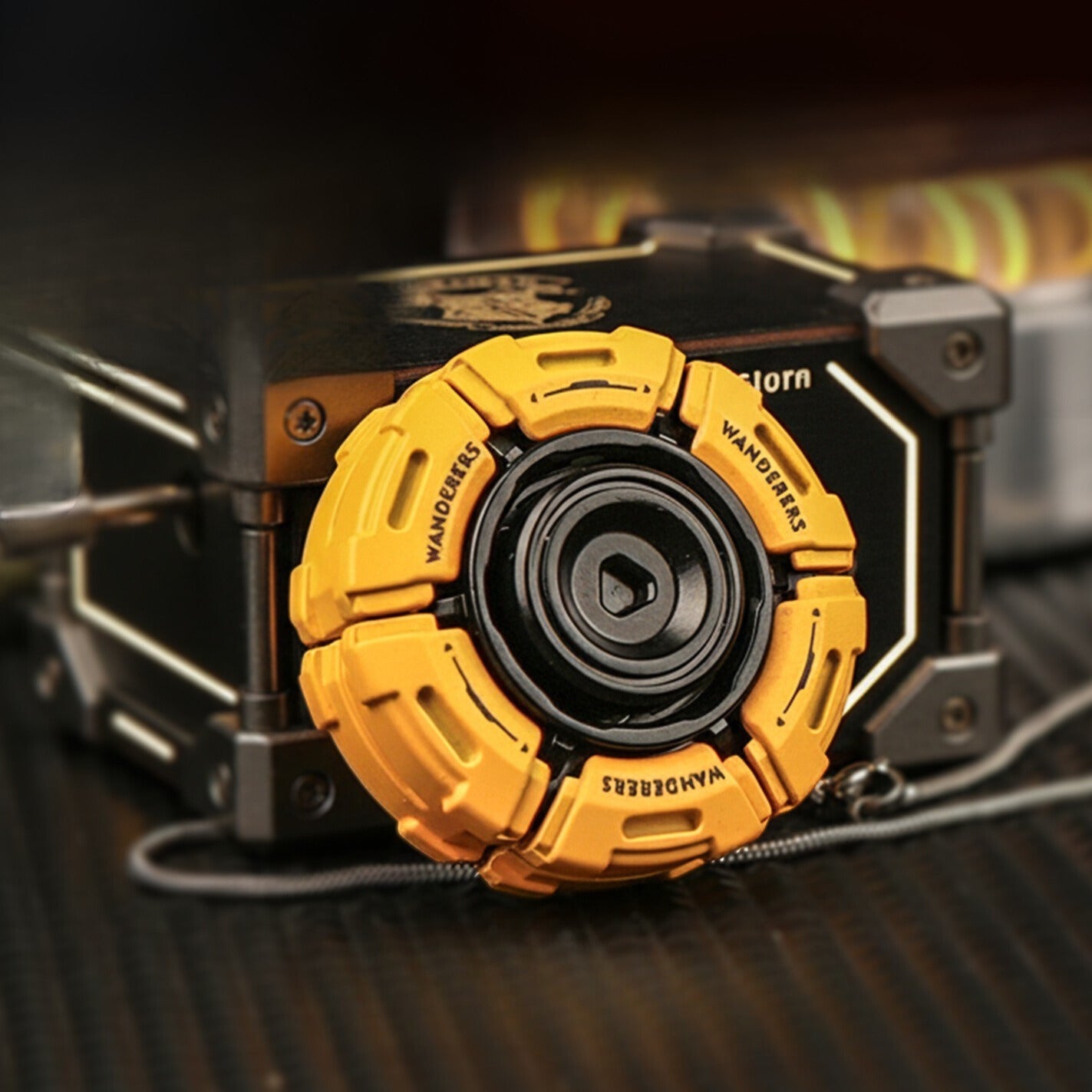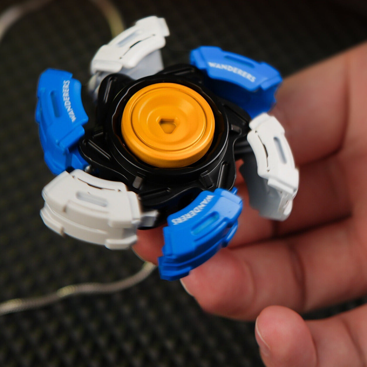 This fidget is an expandable petal-style spinner featuring five hinged “wings” that flare outward as it spins. The center is a smooth metal hub—in bright yellow—surrounded by a rugged black frame, while the wings alternate between blue and white panels labeled WANDERERS.